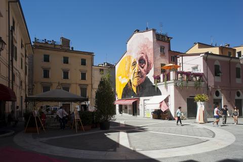 Piazza delle Erbe, Carrara. Sullo sfondo il murales che il duo artistico Orticanoodles ha dedicato a Francesca Rolla, una delle eroine della Resistenza carrarese, che insieme ad altre donne, il 7 luglio del 1944, diede vita a una rivolta contro le truppe di occupazione tedesche